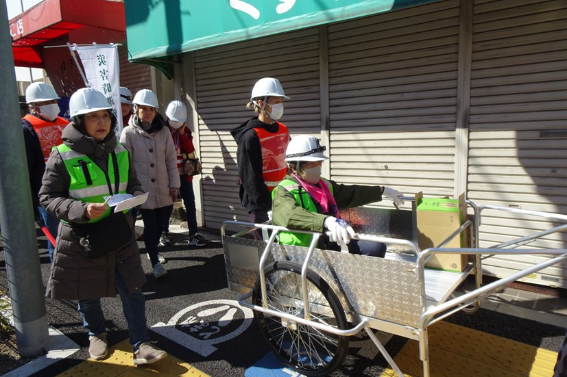 車いすおよびリヤカーを用いた避難誘導体験を実施しました。参加者は、実際に地域を歩きながら、車いすやリヤカーが安全に通行できる幅であるか自ら確認し、実践的な視点で訓練に取り組んでいました。