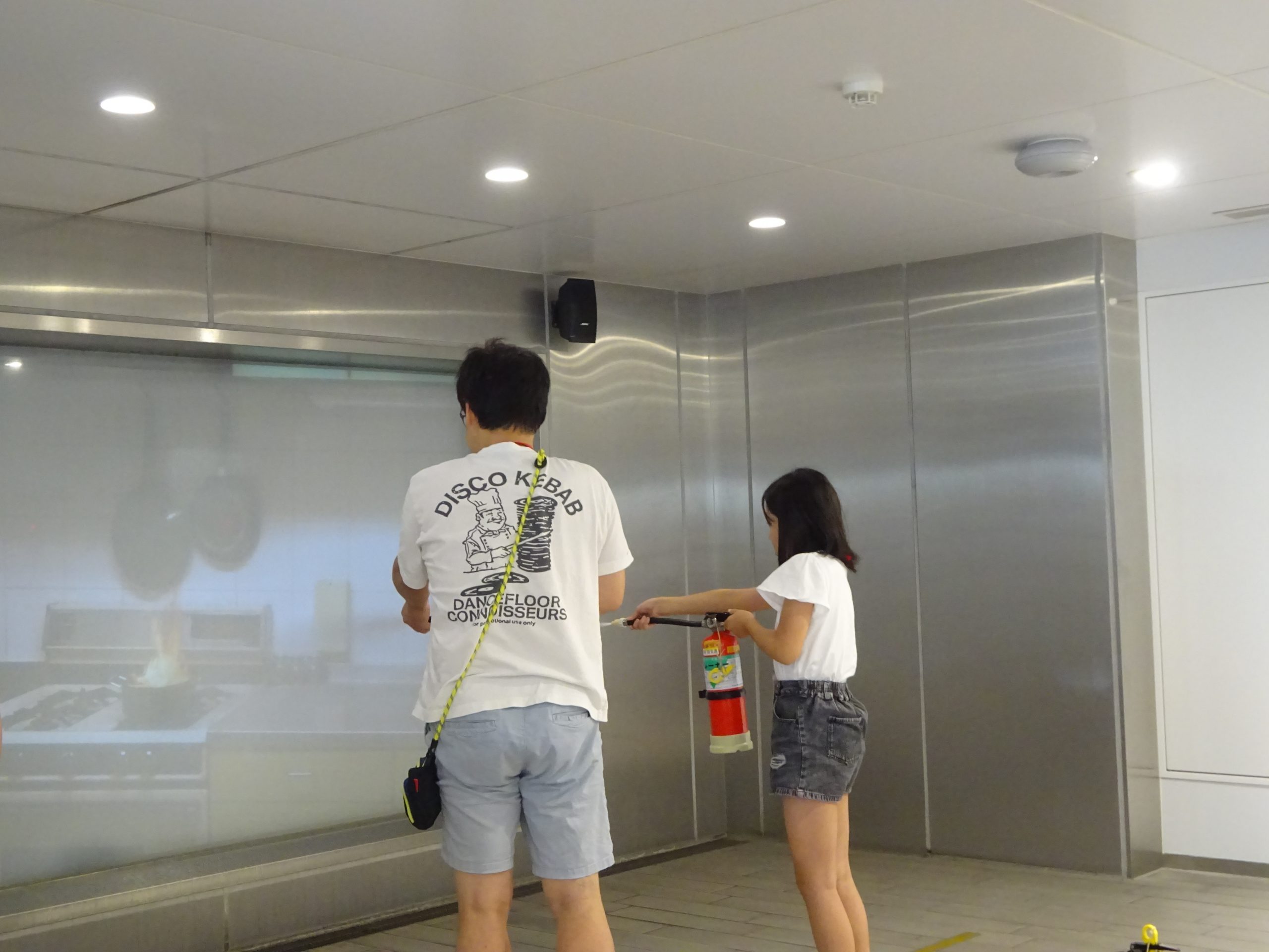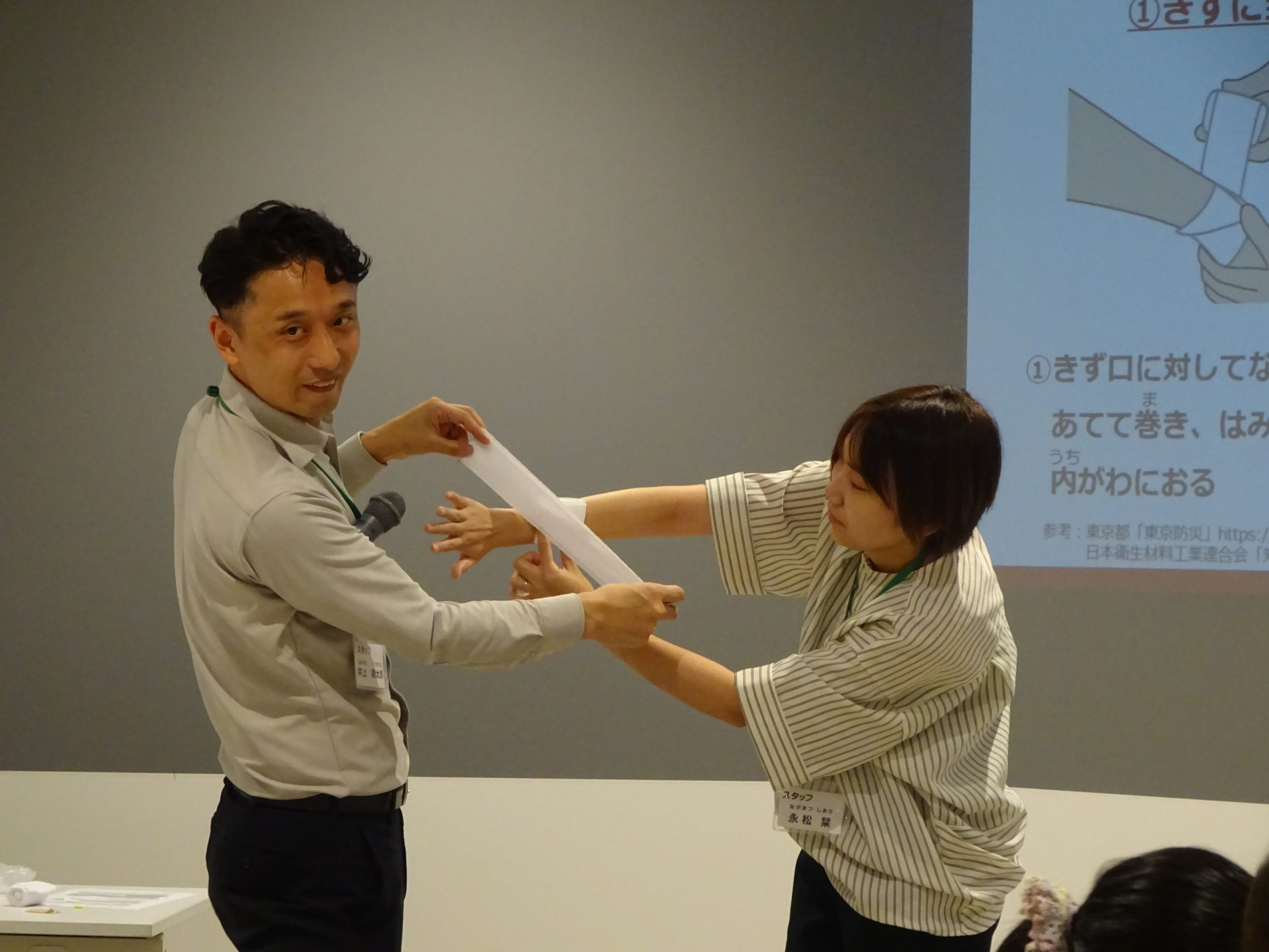 火災を広げないための消火器体験やガーゼと包帯を使った止血の応急手当について学びました。