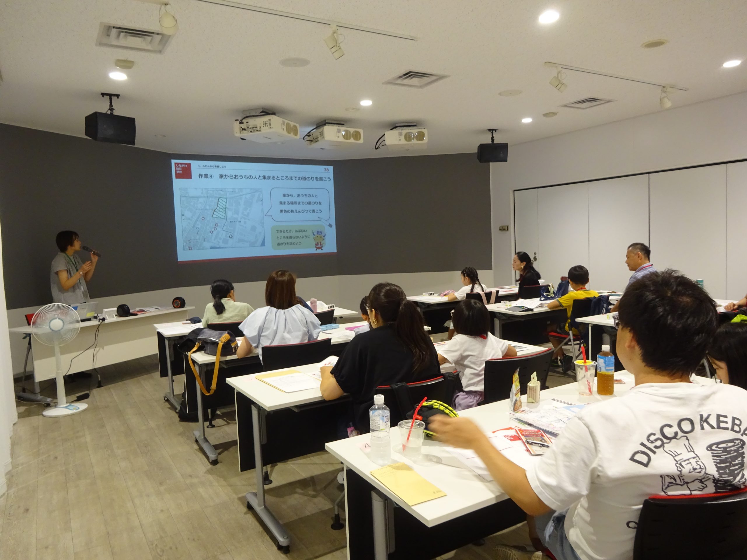 自宅周辺の地図を使った避難経路の確認や、家庭の備蓄状況をワークシートに書き出し、必要な量を考えました。最後には親子で学びや気づきを話し合い、家庭等での防災への意識を高めました。